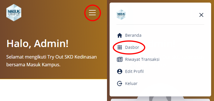 2. Klik menu (icon 3 garis di kanan atas), dan pilih menu “Dasbor”