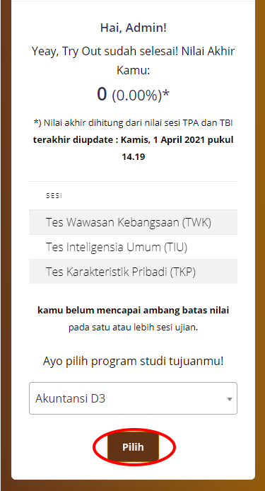 5. Setelah soal SKD selesai kamu kerjakan, hasil ujianmu akan langsung keluar.